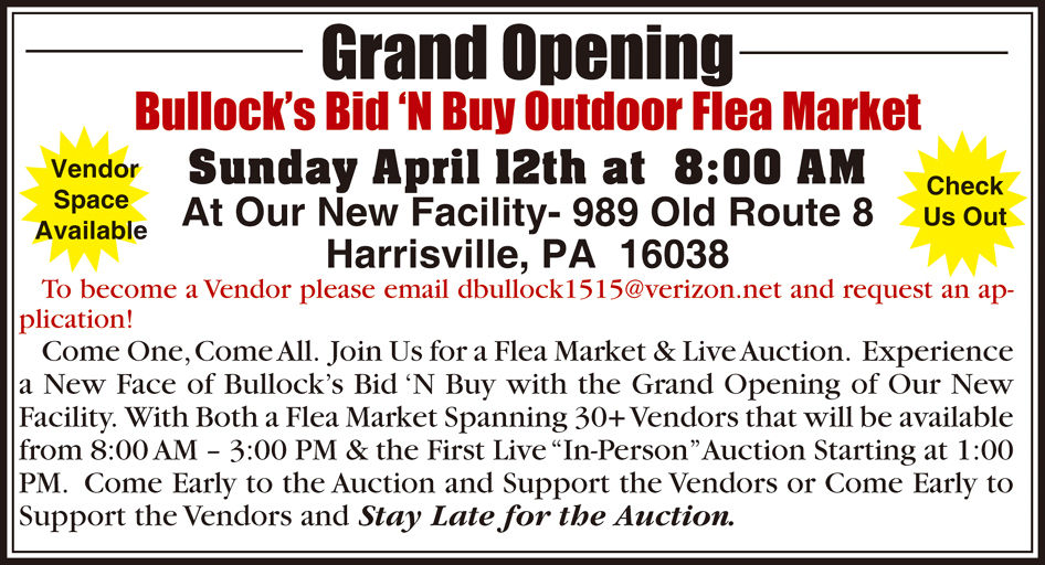 Grand Opening: Bullock's Bid 'N Buy Outdoor Flea Market - April 12EditorApr 41 min readEmail: dbullock1515@verizon.net989 Old Route 8 - Harrisville, PA 16038The First Live "In Person" Auction
